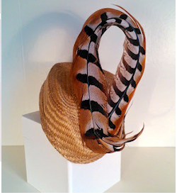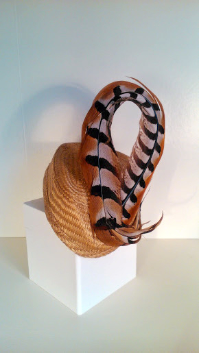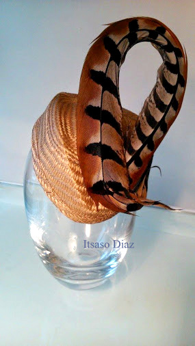 AURUM Descripción: Base dorada, pintada a mano combinada con una preciosa pluma de faisan en tonos dorados marrones y gris. Ideal para acompañar a un vestido negro. Sientete guapa con éste tocado!