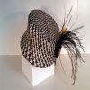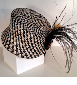 PANAM Descripción: Casquete en blanco y negro con broche de cristal, plumas de avestruz negra y dorada.